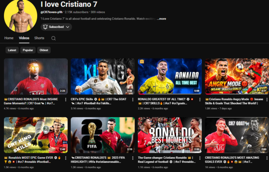 A niche YouTube channel dedicated to Cristiano Ronaldo, featuring exciting videos, highlights, and fan content. With 2,154 subscribers and 100,000 monthly views, it’s perfect for football enthusiasts or content creators looking to grow in the sports niche.