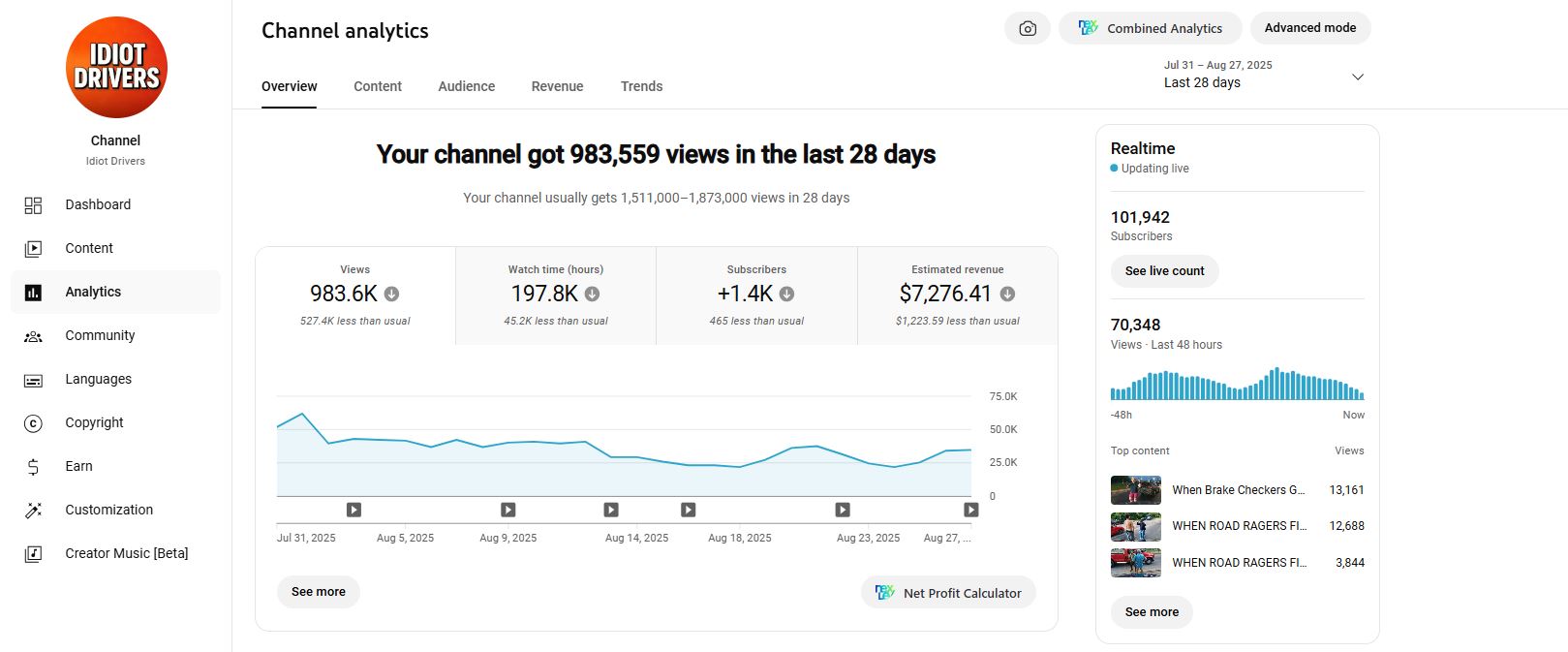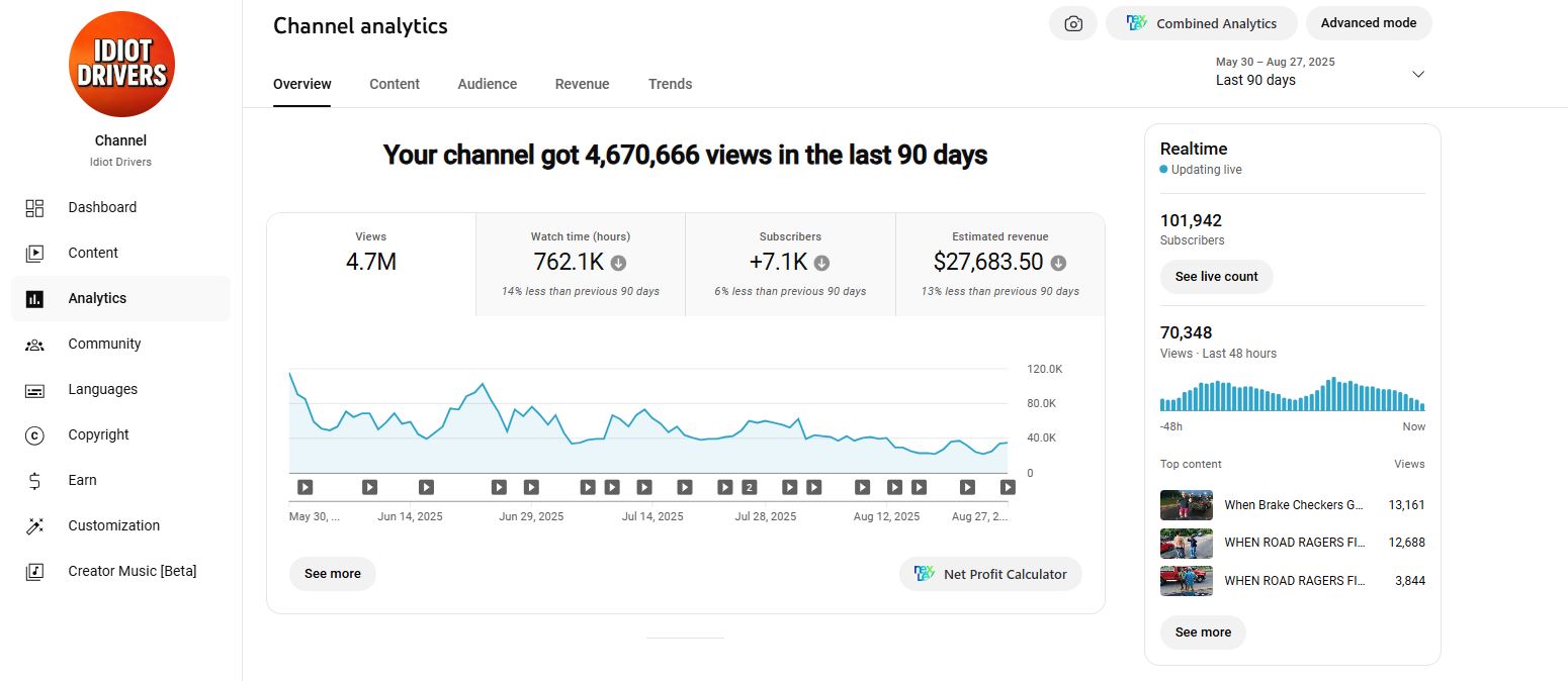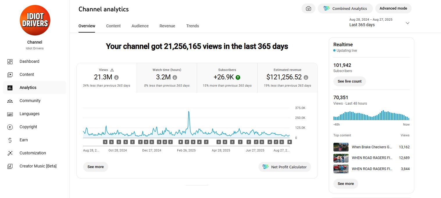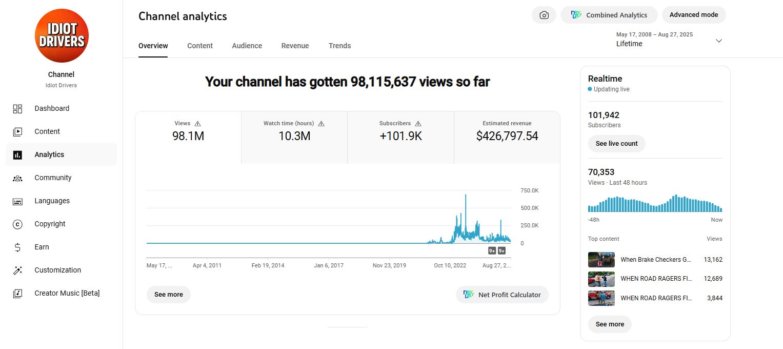 Idiot Drivers is a faceless YouTube channel established in 2008 and actively monetized over the past 4 years. Focused on the entertainment niche, the channel curates viral compilations of driver mishaps, road rage incidents, and car-related fails that resonate with a broad global audience. With over 98 million lifetime views and 101,946 active subscribers, the brand has established itself as a high-engagement, ad-revenue-driven content asset. Over the past 12 months, the channel generated USD $118,492 in revenue and USD $111,496 in net profit, yielding a 94% profit margin.