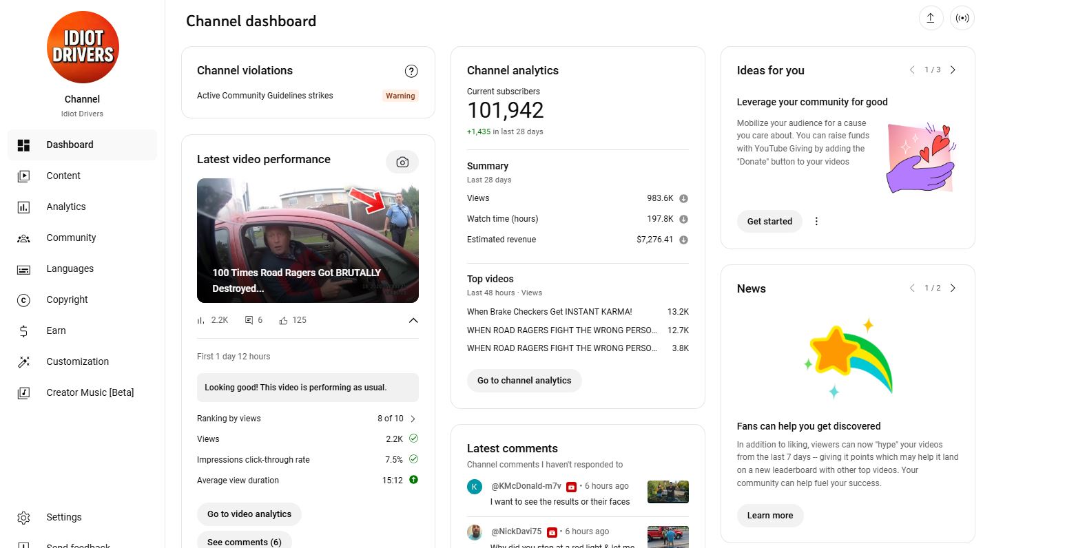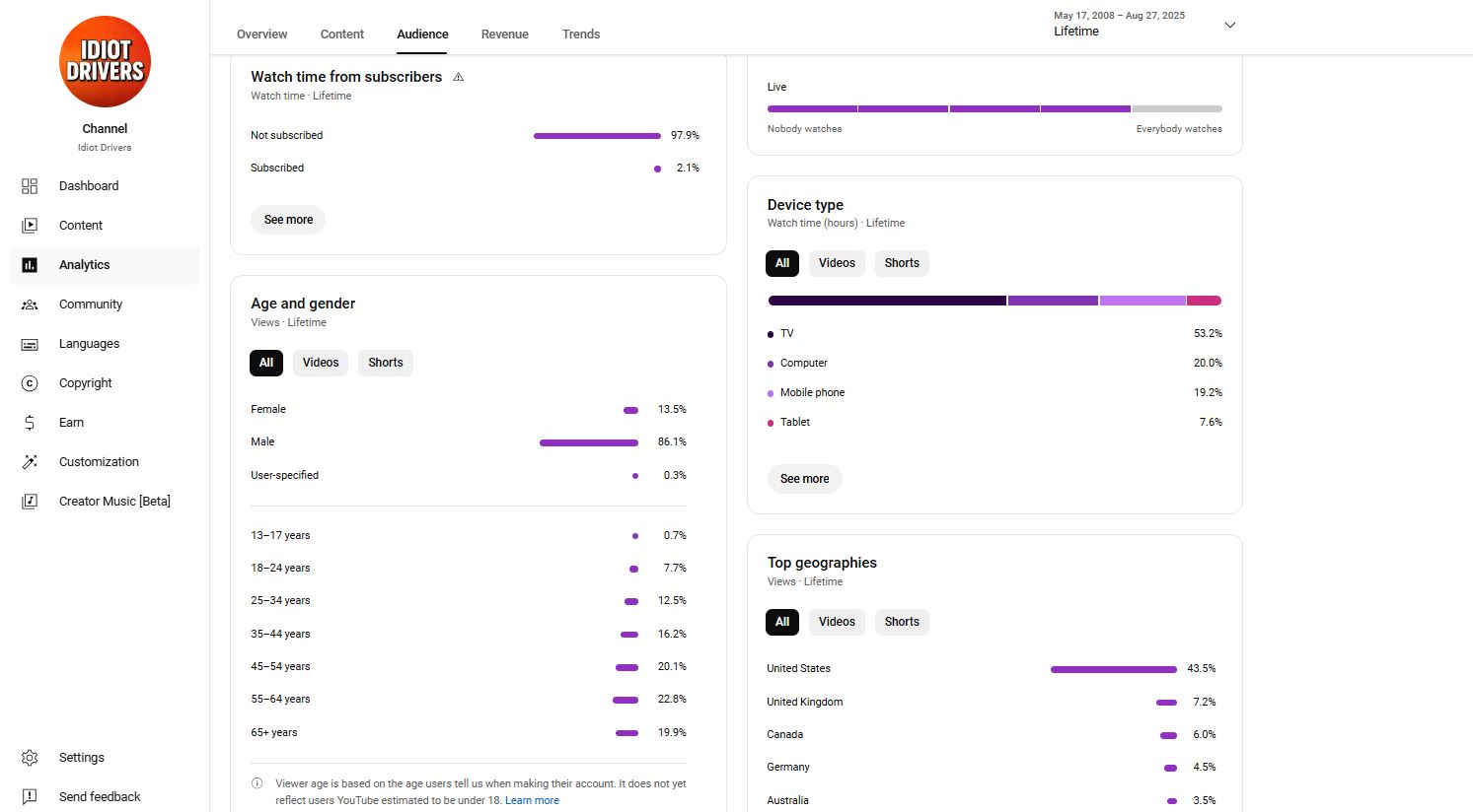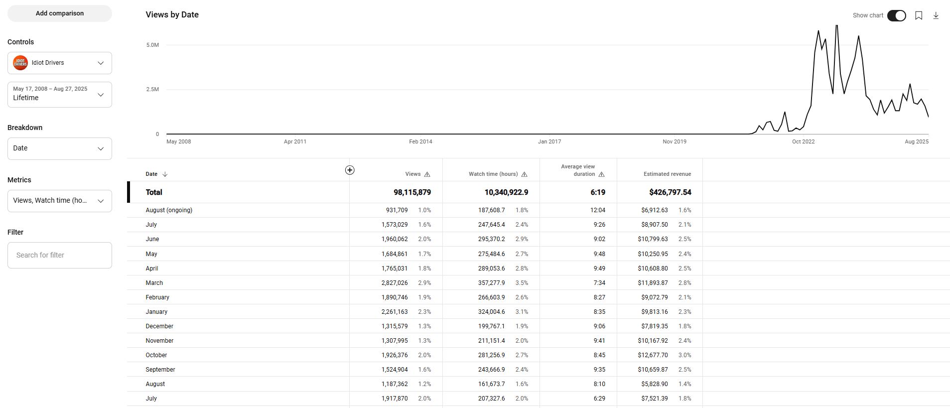 Idiot Drivers is a faceless YouTube channel established in 2008 and actively monetized over the past 4 years. Focused on the entertainment niche, the channel curates viral compilations of driver mishaps, road rage incidents, and car-related fails that resonate with a broad global audience. With over 98 million lifetime views and 101,946 active subscribers, the brand has established itself as a high-engagement, ad-revenue-driven content asset. Over the past 12 months, the channel generated USD $118,492 in revenue and USD $111,496 in net profit, yielding a 94% profit margin.