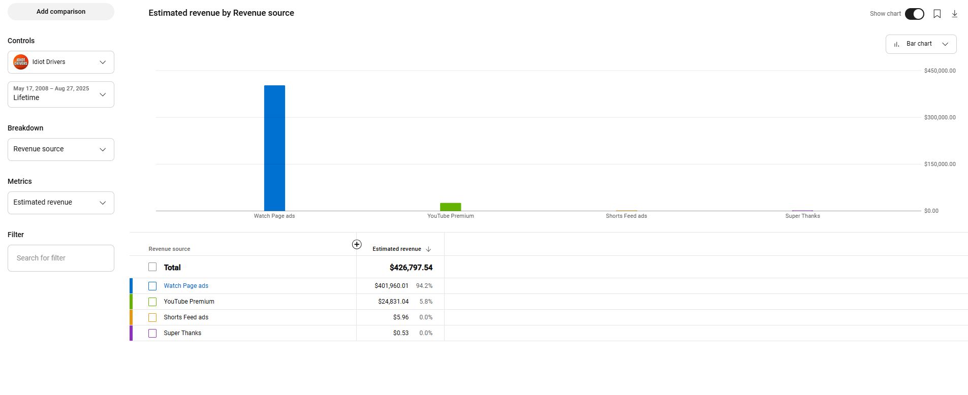 The channel has delivered consistent monetization through Google AdSense, averaging between USD $9,000–$12,000 per month for the past four years. Monthly fluctuations are tied to seasonal ad RPM trends, with peaks in Q4 due to holiday advertiser demand. Revenue sources are highly concentrated in Watch Page Ads (94.2%), with additional contributions from YouTube Premium (5.8%). Lifetime revenue totals USD $426,797.