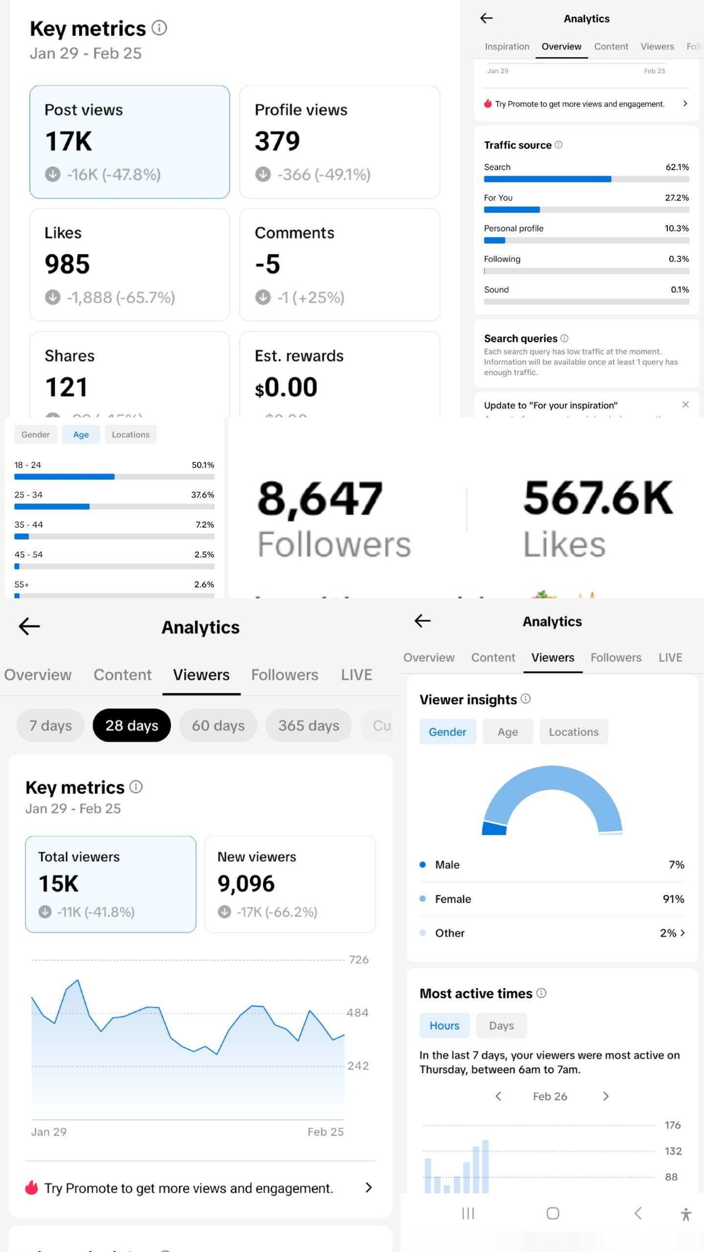 8.6K followers and 568K total likes.