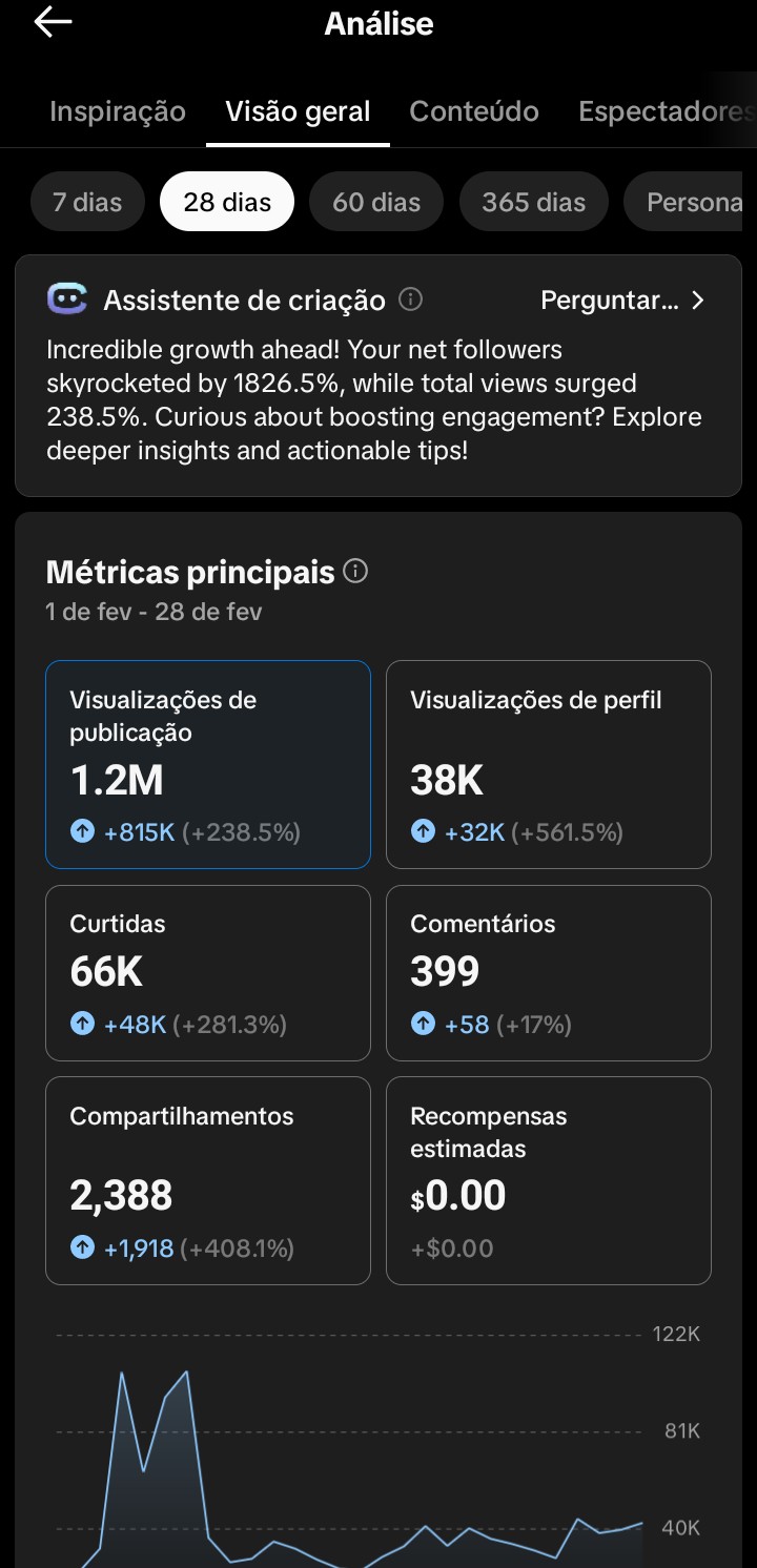Conta ativa com público majoritariamente brasileiro. Média de aproximadamente +500.000 de visualizações mensais, com seguidores orgânicos e bom engajamento.